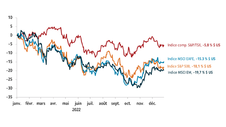 Dans cette conjoncture, les actions ont connu quelques remontées lors des marchés baissiers : une brève remontée suivie d’un renversement des gains. En 2022, l’indice S&P 500 a perdu 19 % et l’indice Nasdaq, à forte composante technologique, a dégringolé de 33 %. L’indice composé S&P/TSX (Canada) a mieux fait avec une baisse de 8,5 %. Les marchés internationaux ont eux aussi souffert. En effet, les marchés développés et les marchés émergents ont tous les deux subi des pertes dans les 2 chiffres. Les actions à forte croissance ont perdu une grande partie de leurs gains des dernières années et les actions de valeur ont dépassé les actions de croissance en 2022.