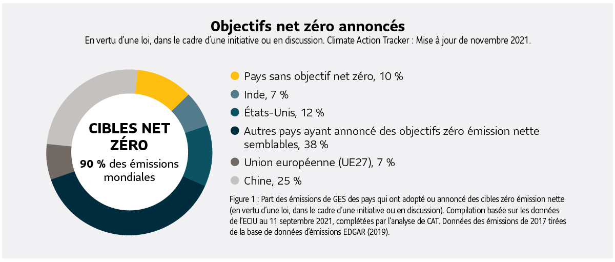 En 2015, la conférence de l’ONU sur les changements climatiques a abouti à l’Accord de Paris qui prévoit l’atteinte de la carboneutralité d’ici la deuxième moitié du 21e siècle (2050) pour atténuer les effets des changements climatiques. Cet engagement a été réitéré au récent sommet COP26, qui a de nouveau fait ressortir les difficultés du parcours alors que des pays émergents comme l’Inde et la Chine ont négocié le calendrier de réduction de leurs émissions. Au 2 novembre 2021, plus de 140 pays responsables de 90 % des émissions mondiales avaient annoncé ou envisageaient des objectifs zéro émission nette, contre 130 pays représentant environ 70 % des émissions en mai 2021.